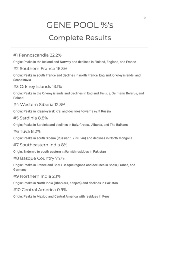 Der Test analysiert mehr als 80.000 genetische Marker und vergleicht Ihre DNA mit mehr als 1.000 Referenzpopulationen, die in 41 Genpools gruppiert sind. Die Ergebnisse liegen nach 6 bis 9 Wochen in einem 18-seitigen PDF-Bericht vor.